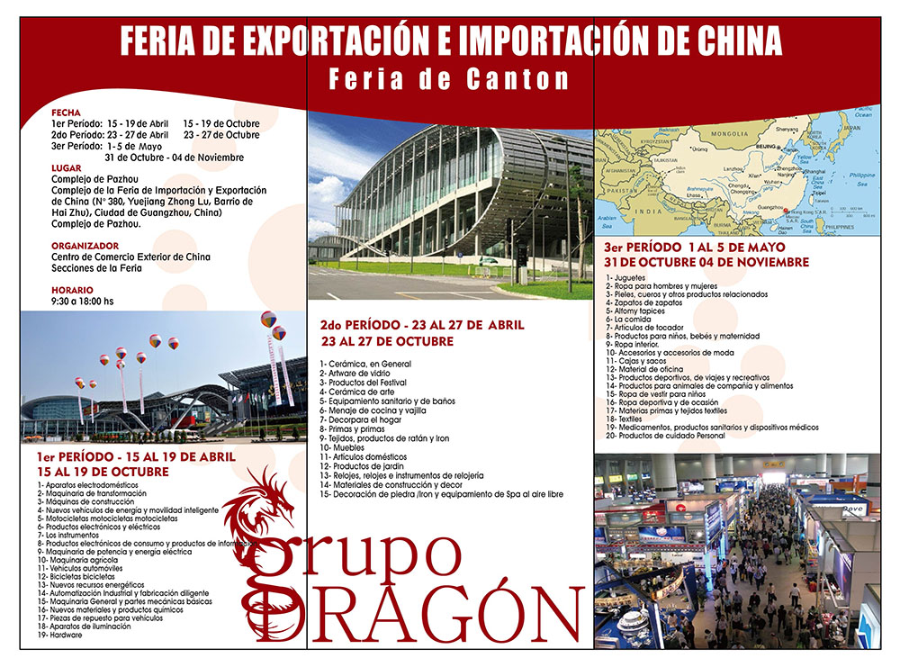 La Foire d’Importation et d’Exportations de Chine ( à l’origine on l’appelait la Foire d’articles Chinoises pour l’exportation, ou simplement la Foire de Canton) a commencée l’année 1957 et elle est célebrée en printemps et en automne de chaque année à Guangzhou, en Chine.